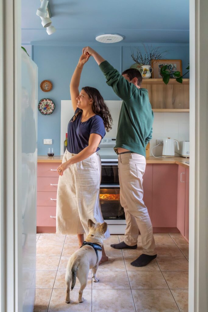Poppy’s Place (sleeping six) is framed by Peppermint trees and alive with birdlife – Australian Ringnecks, Honeyeaters, and Fairywrens often flit through the garden. Inside, a crackling wood fire, vintage record player, and cottage-core touches create instant warmth, while the spacious yard is perfect for playful pets and kids.