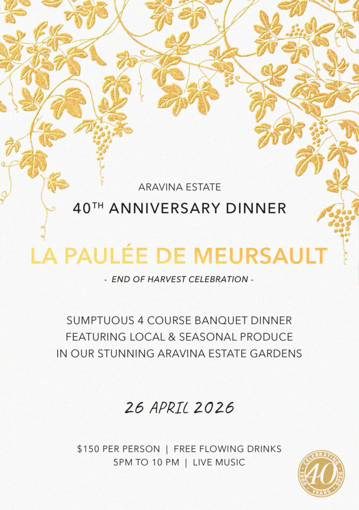 Join us for an unforgettable evening as we celebrate 40 years of the Estate. A wonderful opportunity to gather around a banquet dinner showcasing seasonal, locally sourced produce and to celebrate the end of harvest. Set in the gardens of Aravina Estate, enjoy great food, fine wines and wonderful company, for a night to remember.