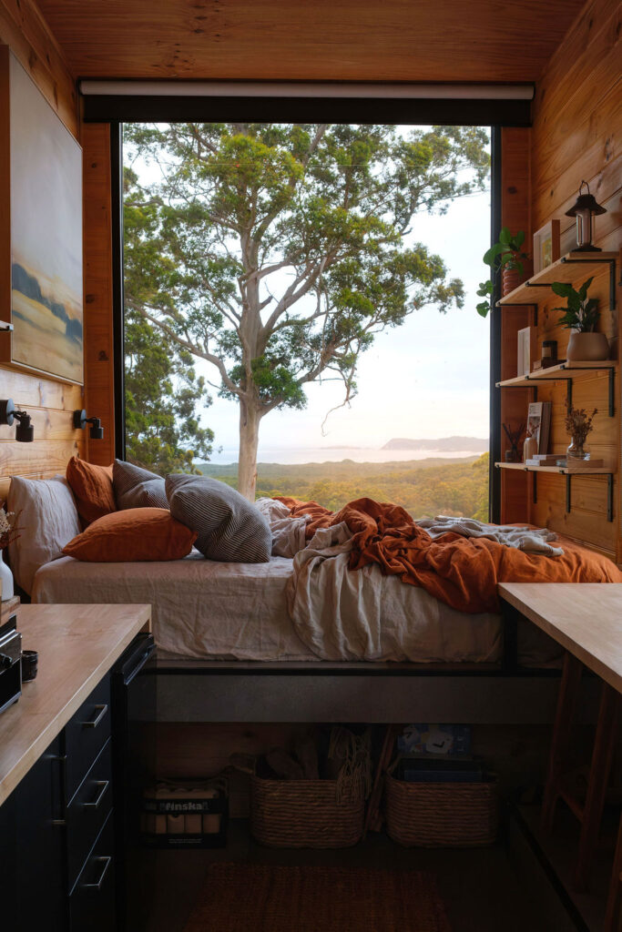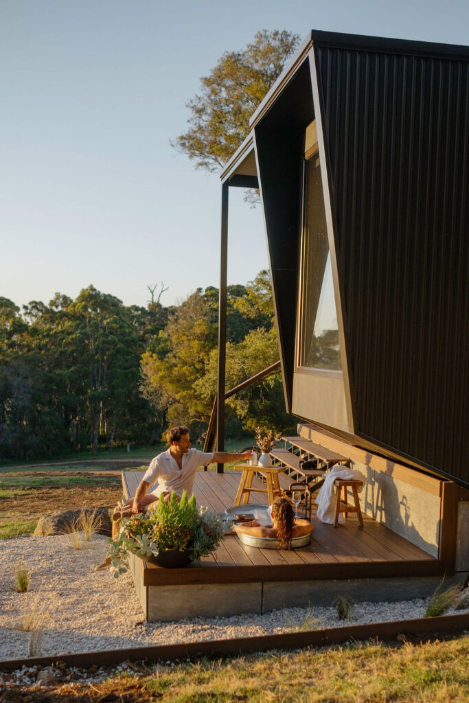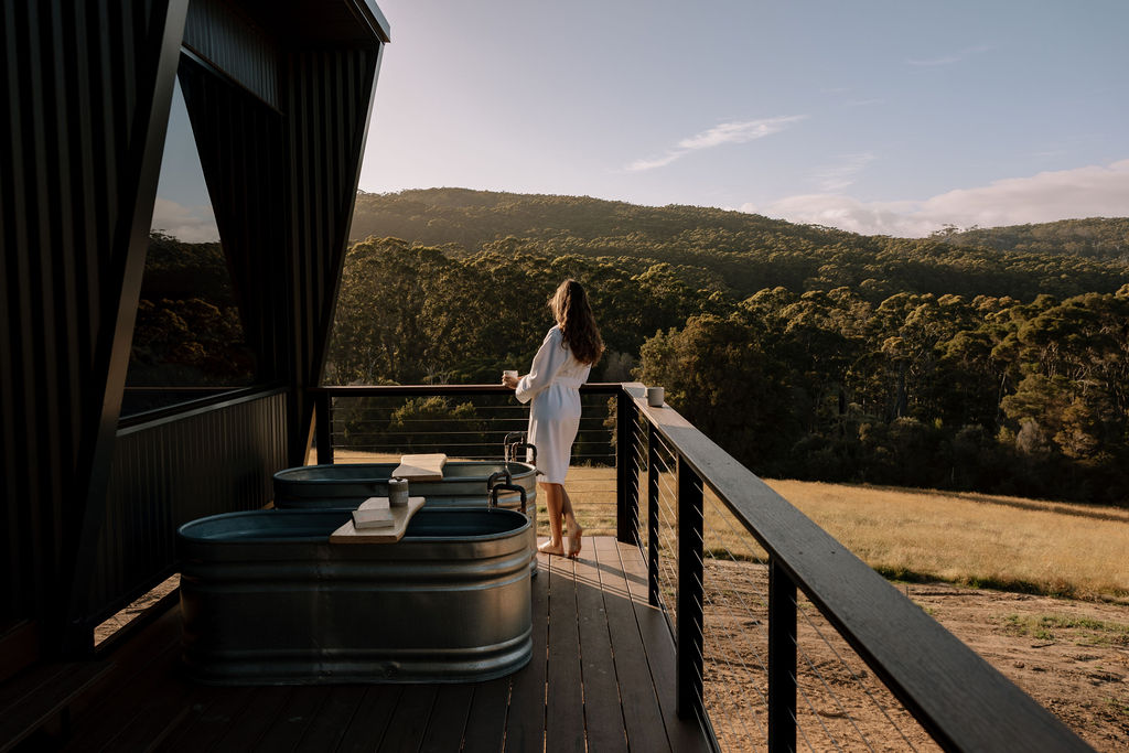 Cabin Sand is positioned midway up the hill, perched on a paddock between towering trees. Watch the sky turn orange at sunset, then unwind in the warm outdoor bath after a day exploring Denmark’s beaches, trails and local produce.