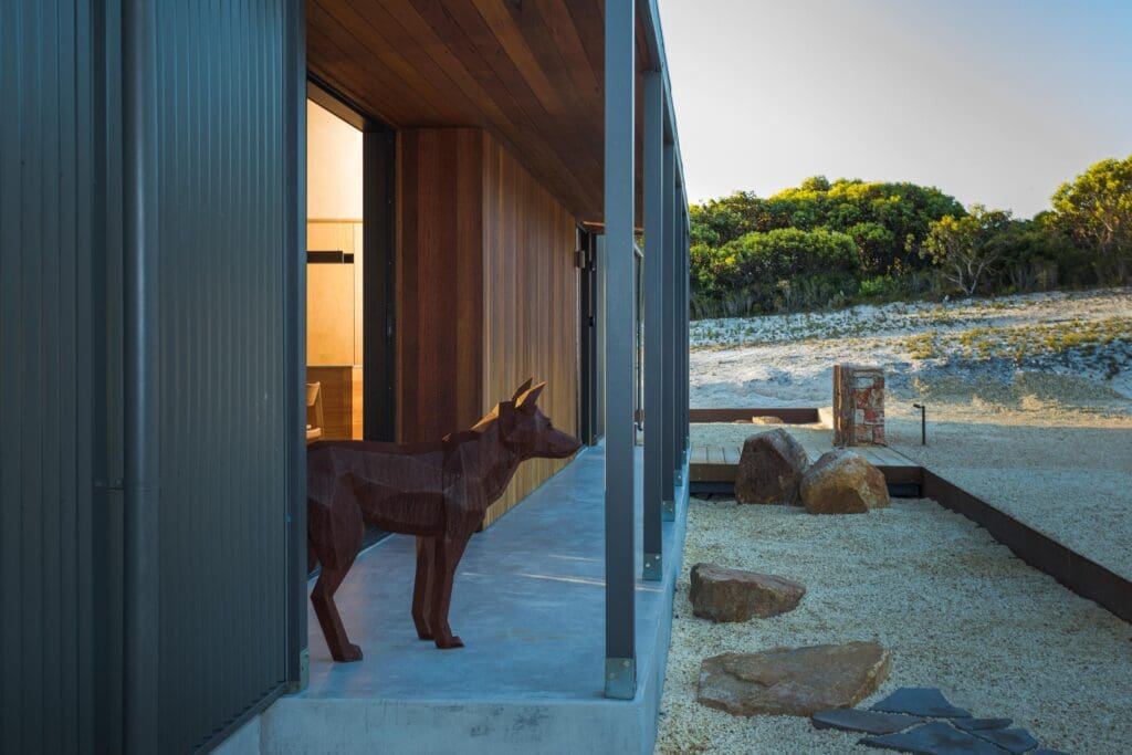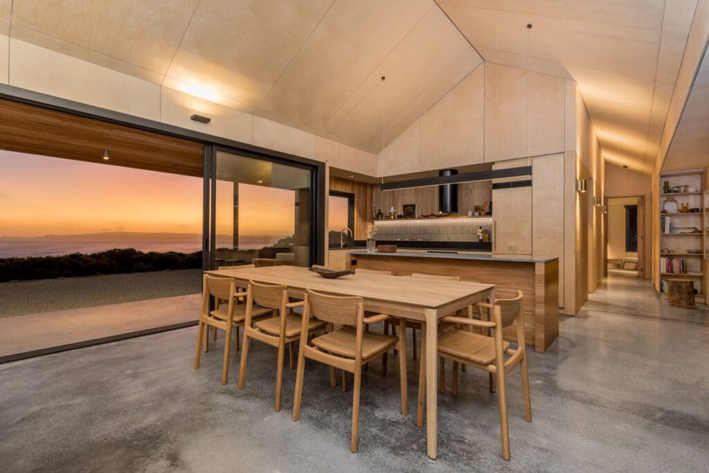 The long-house design draws inspiration from the local farm sheds and fishing shacks, its architectonic form sitting discretely within the coastal landscape. The carefully detailed use of raw materials such as corrugated iron, timber and concrete to both internal and external spaces, creates a relaxed and comfortable cabin feel.