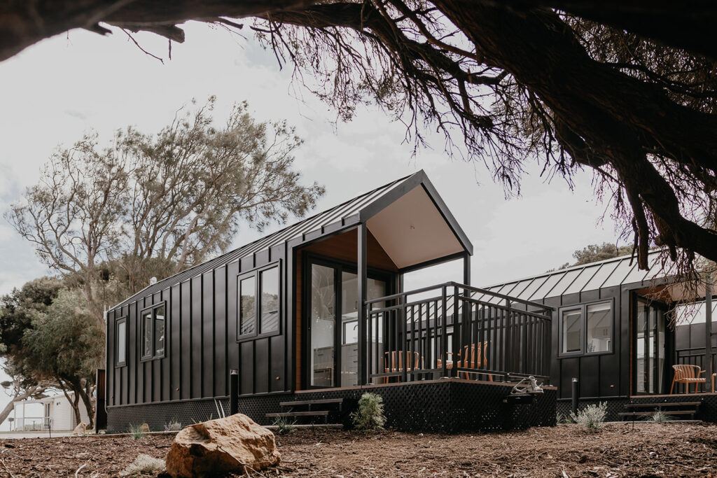 Shady Banksia trees shelter grassy sites for vans and tents, while cabins sit just steps from the morning surf.
